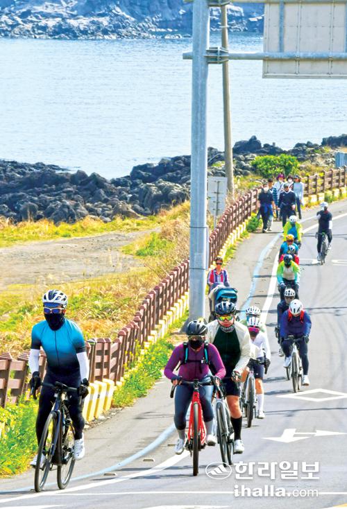 11일 제주시 애월읍 애월해안도로에 자전거를 이용해 제주 관광에 나선 라이더들이 봄 바다를 느끼며 힘차게 페달을 밟고 있다. 강희만기자