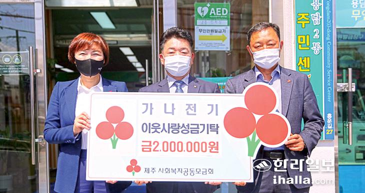 가나전기(대표 양영근)는 지난 11일 제주시 용담2동주민센터에서 이웃사랑 성금 200만원을 제주사회복지공동모금회에 기탁했다. 이번 성금은 봄을 맞아 이웃에게 따뜻한 마음을 전하고자 마련됐다.