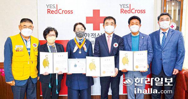 대한적십자사제주특별자치도지사(회장 오홍식)는 지난 11일 적십자사 회장실에서 고영수 전부회장에게 대한적십자사 광무장과 명예고문 위촉장을, 강두영·김순이 부회장에게 선임증을 전달했다.