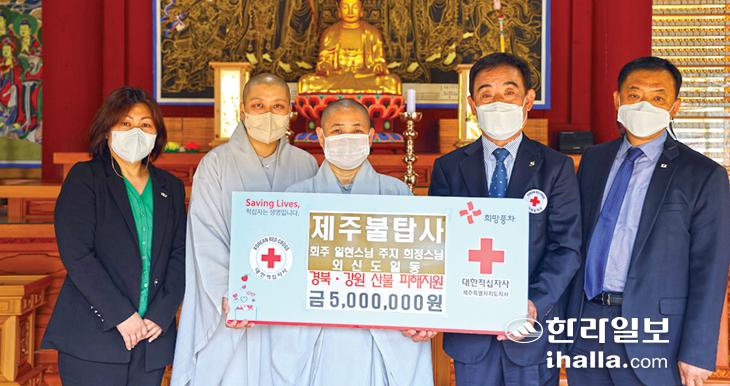 제주불탑사 회주 일현스님, 주지 희정스님 및 신도 일동은 최근 불탑사에서 대한적십자사제주지사에 경북·강원 산불피해 지역 지원을 위해 써달라며 성금 500만원을 전달했다. 이번 성금은 불탑사 회주 일현스님, 주지 희정스님과 신도회원들이 십시일반 마련한 것이다.