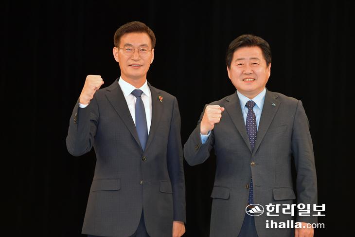 19일 열린 KBS제주 초청 더불어민주당 제주도지사 경선 후보 토론회에서 문대림 후보와 오영훈 후보가 화이팅을 하고 있다. 강희만 기자