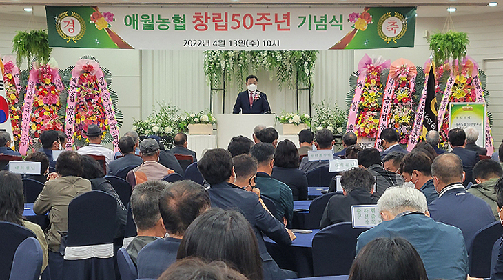 애월농협(조합장 김병수)은 지난 13일 애월농협 대회의실에서 전 조합장, 대의원, 임원, 내부조직장 등 170여명이 참석한 가운데 창립 50주년 기념식 및 기념비 제막식을 개최했다.
