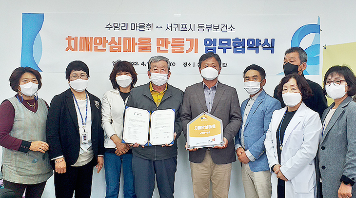 서귀포시 동부보건소(소장 송순오)는 지난 19일 남원읍 수망리 마을을 치매안심마을로 선정, 주민과 함께하는 '치매안심마을 만들기' 협약을 체결했다.