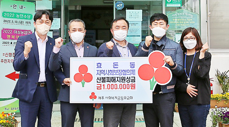 서귀포시 효돈동지역사회보장협의체(위원장 강승훈)는 지난 18일 효돈동주민센터에서 산불피해 지원성금 100만원을 제주사회복지공동모금에 기탁했다.