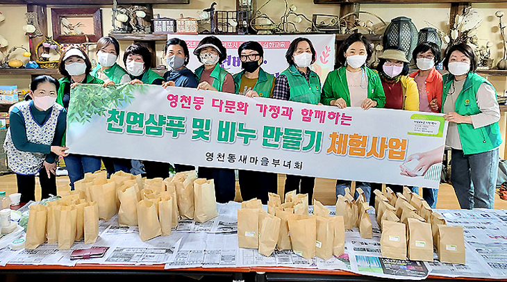 서귀포시 영천동새마을부녀회(회장 유진의)는 지난 20일 서귀포시 보목동 소재 예지원에서 다문화가정과 함께하는 천연 샴푸 및 비누 만들기 체험 프로그램을 실시했다. 이날 만든 샴푸와 비누는 영천동에 거주하는 어려운 가정 50가구에 배부됐다.