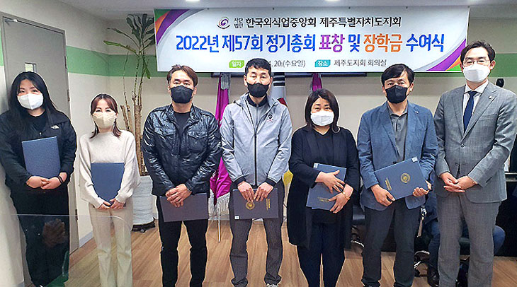 제주 향토기업 (주)한라산(대표이사 현재웅)은 지난 20일 열린 (사)한국외식업중앙회 제주특별자치도지회의 2022년 제 57회 정기총회 표창 및 장학금 수여식에서 한국외식업중앙회 제주지회 우수 장학생 6명에게 총 300만원을 전달했다. (주)한라산은 제주 지역인재 육성과 소상공인과의 상생을 위해 지난 2009년부터 매년 한국외식업중앙회 회원 자녀들에게 장학금을 전달하고 있다.