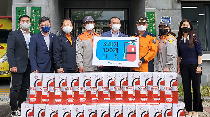 성읍 남·여 의용소방대(대장 김사훈·여미경)와 제주국제자유도시개발센터(JDC·이사장 양영철)는 지난 25일 주택용 소방시설 설치 확산 및 지역 주민의 화재안전을 위한 주택용 소방시설(소화기 100개) 기증행사를 개최했다.