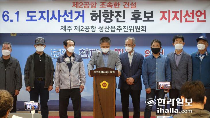 제주 제2공항 성산읍 추진위원회 관계자들이 10일 제주도의회에서 기자회견을 열고 있다. 김도영기자