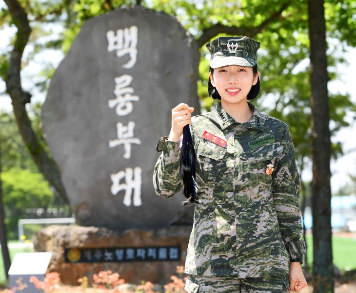 해병대 제9여단에서 근무 중인 이다희 대위가 소아암 환자들의 가발 제작에 쓰일 모발을 들고 기념 촬영하고 있다. 해병대 제공