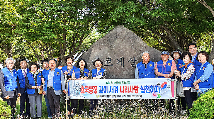 바르게살기운동 제주특별자치도협의회(회장 좌중언)는 지난 2일 호국보훈의 달을 맞아 바르게의 날 전국 동시 캠페인 '호국충정 깊이새겨 나라사랑 실천하자'를 주제로 캠페인을 전개했다.