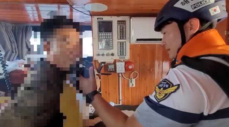지난 25일 제주해경 대원이 선장 A 씨에 대한 혈중알코올농도를 측정하고 있다. 제주해양경찰서 제공