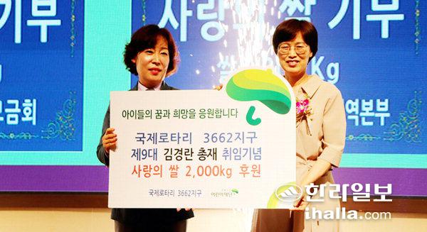 국제로타리 3662지구(총재 김경란)는 지난 2일 메종글래드 제주에서 열린 제9대 총재 취임식에서 초록우산 어린이재단 제주지역본부(본부장 박정숙)에 사랑의 쌀 2000㎏을 전달했다.