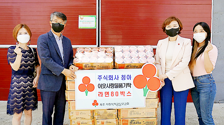 (주)청아(대표 정민호)는 지난 6일 제주특별자치도 사회복지협의회(회장 고승화)에서 지역사회 어려운 이웃들을 위해 사용해달라며 라면 80박스를 제주사회복지공동모금회(회장 강지언)에 기탁했다.