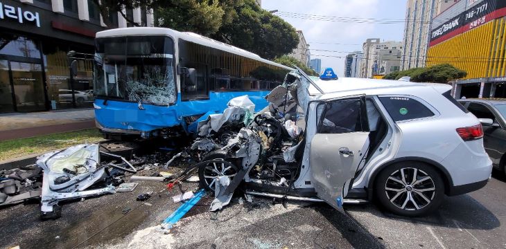 12일 제주시 연동 신광사거리에서 발생한 택시와 버스 교통사고 현장. 제주소방서 제공