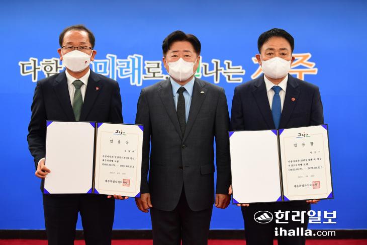 오영훈 도지사가 23일 강병삼(왼쪽) 제주시장 내정자와 이종우(오른쪽) 서귀포시장 내정자에게 행정시장 임명장을 수여했다. 강희만기자