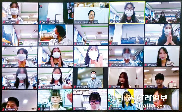 서귀포시는 지난 20일 국제화교과특성화학교 삼성여고 3학년 학생 10명과 일본 교류도시 구루메시 6개 고교 학생 10명이 온라인으로 문화교류를 추진했다고 23일 밝혔다. 참가 학생들은 자기 고장과 학교를 소개했고 영어, 일본어, 한국어를 자유롭게 사용하며 서로의 관심사에 대한 자유토론을 진행했다.