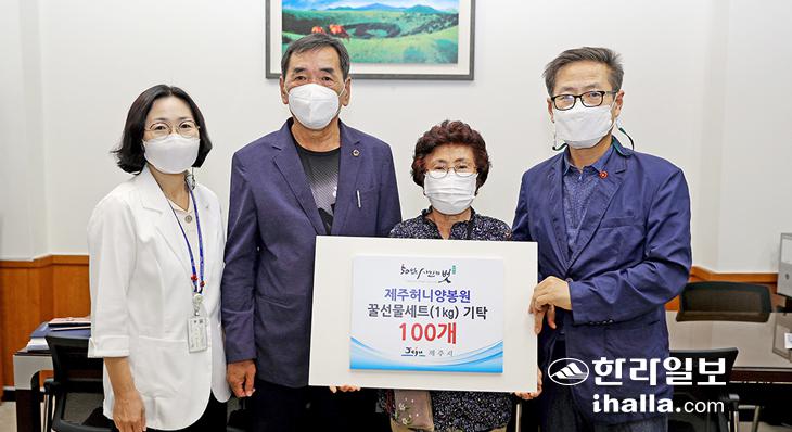 제주시 화북동 소재 제주허니양봉원(대표 김형후)에서는 24일 추석 명절을 앞두고 지역의 어려운 이웃에게 전달해 달라며 꿀(1㎏) 선물세트 100개(300만원 상당)를 제주시에 기탁했다.