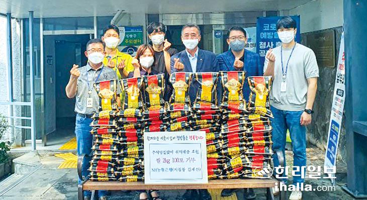 NH농협은행 남제주지점(지점장 김재선)은 24일 서귀포시 정방동주민센터와 LH아파트 주택관리공단 서귀포동홍3관리소(소장 박수영)를 방문, 이웃들을 위해 소포장 쌀(2㎏)을 각각 100포씩 전달했다고 밝혔다.