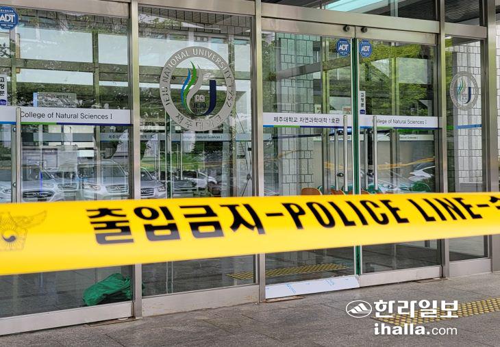 26일 독성 화학물질인 \'포르말린\' 누출사고가 발생한 제주대학교 자연과학대학에 출입 통제선이 설치돼 있다. 김도영기자