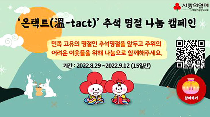 제주사랑의열매(회장 강지언)는 민족대명절 추석을 앞두고 소외된 이웃과 함께하는 나눔문화를 조성하고자 '온택트(溫-tact) 추석 명절' 나눔캠페인을 전개한다고 29일 밝혔다.