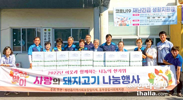 성산읍지역사회보장협의체(공동위원장 현동식, 문경옥)는 지난 8일 추석을 맞아 독거노인, 장애인 100가구를 대상으로 위문을 실시하며 200만원 상당의 돼지고기 세트를 전달했다.