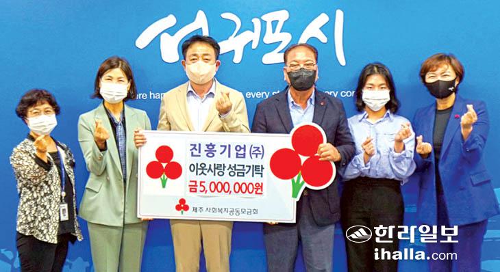 진흥기업(주)(대표 이철수)는 지난 13일 서귀포시청에서 지역사회 어려운 이웃을 위해 사용해 달라며 성금 500만원을 제주사회복지공동모금회(회장 강지언)에 기탁했다. 이날 기탁된 성금은 진흥기업이 이웃들에게 수익 일부를 환원하고자 마련됐다.