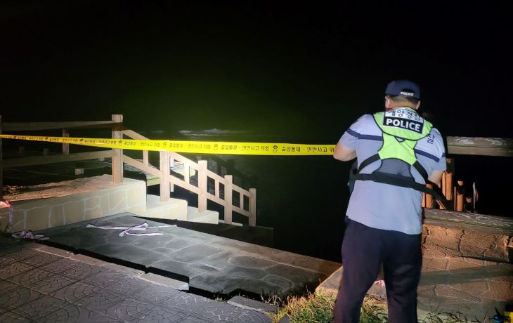 제주해경 대원이 연안사고 위험예보제 '주의보' 격상에 따라 위험 지역에 대한 출입통제선을 설치하고 있다. 제주지방해양경찰청 제공