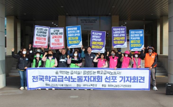 학교비정규직연대회의 관계자들이 12일 제주도교육청 앞에서 기자회견을 열고 있다.