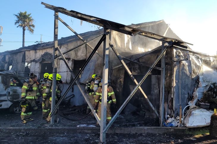 20일 오전 화재가 발생한 제주시 이호1동 수산물 냉동창고의 모습. 제주소방서 제공