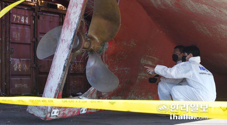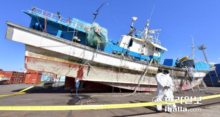 24일 서귀포항에서 제주지방해양경찰청 과학수사계와 국립과학수사연구원, 한국해양교통안전공단 합동 감식팀이 인양된 2006만진호에 대한 선체 감식을 진행하고 있다. 이상국기자