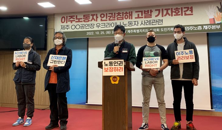 25일 제주도의회 도민카페에서 '제주 공연예술비자 이주노동자 인권침해 고발 기자회견'이 열리고 있다.