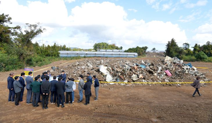 제주특별자치도의회 환경도시위원회가 지난 26일 서귀포시 표선면 세화리 양돈장 폐기물 불법 매립 장소를 현장 방문해 살펴보고 있다. 제주도의회 제공