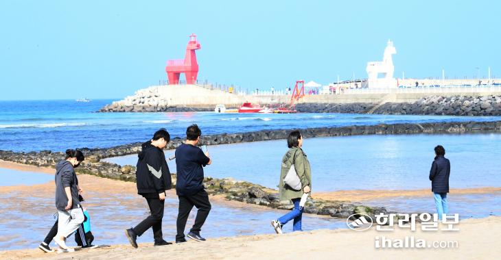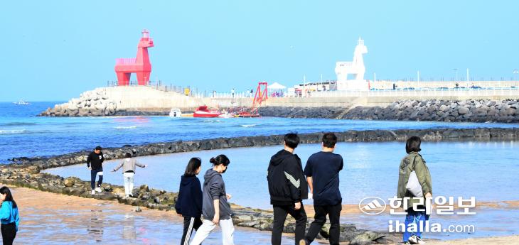 2일 제주시 이호테우해수욕장을 찾은 관광객들이 가을 바다를 구경하고 있다. 이상국기자
