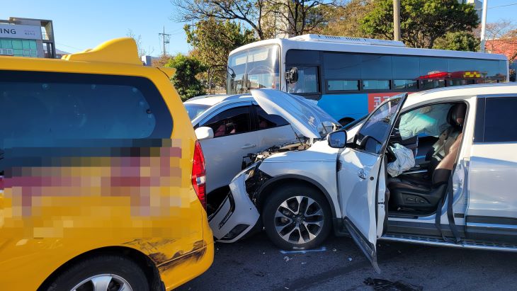 3일 오전 4중 추돌사고가 발생한 제주시 오라동 오라오거리 인근 현장의 모습. 제주소방서 제공