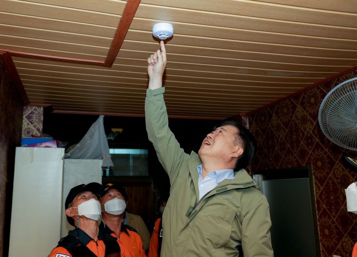 8일 오영훈 도지사가 독거노인 가구를 찾아 화재경보기를 설치하고 있다. 제주도소방안전본부 제공