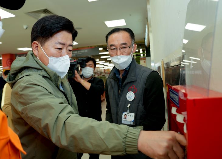 오영훈 제주도지사가 8일 홈플러스 서귀포점을 방문해 소방·경보장비에 대한 작동 여부를 확인하고 있다. 제주도소방안전본부 제공