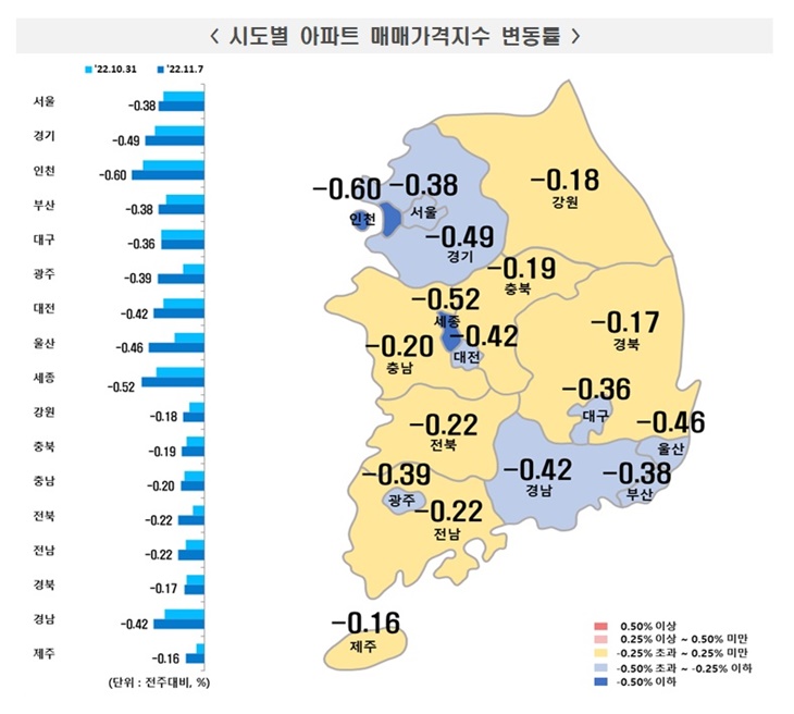 하지만 도내 아파트값 하락폭은 전국에서 가장 낮았다. 인천(-0.60%), 세종(-0.52%), 경기(-0.49%), 울산(-0.46%), 경남(-0.42%), 대전(-0.42%), 광주(-0.39%), 부산(-0.38%), 서울(-0.38%) 등 전국 17개 시·도 모두 지난주보다 하락폭이 확대됐다. 제주 다음으로는 경북(-0.17%), 강원(-0.18%)의 하락폭이 낮았다.