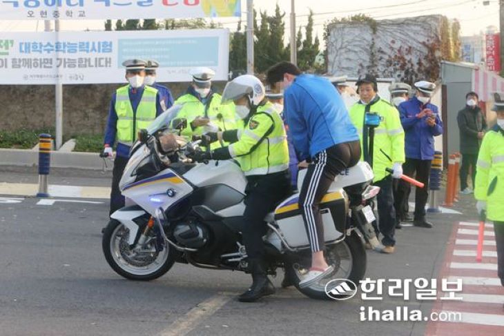 2022학년도 대학수학능력시험 당일 경찰 오토바이를 타고 온 수험생을 모습. 한라일보 DB