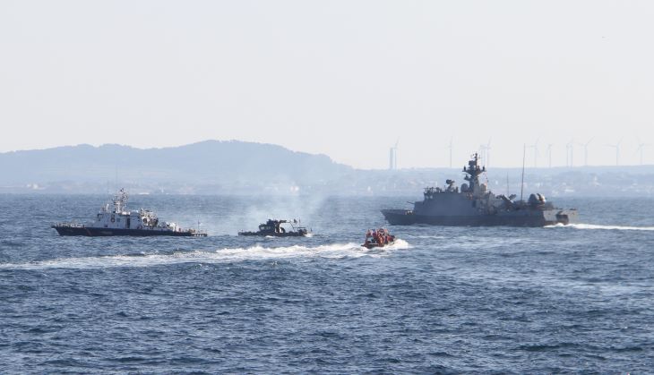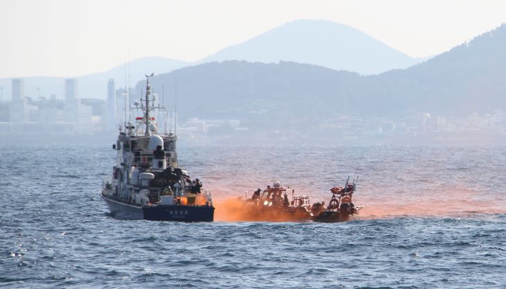 제주해양경찰서는 15일 제주항 인근 해상에서 해군·제주해안경비단·제주어선안전조업국 등 4개 유관기관과 합동 방호 훈련을 실시했다. 제주해양경찰서 제공
