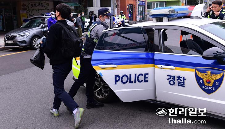 2023학년도 대학수학능력시험일인 17일 오전 고사장을 잘못 찾은 한 수험생이 제주경찰의 도움으로 제주제일고 시험장에 도착해 제시간에 입실하기 위해 달리고 있다. 강희만 기자