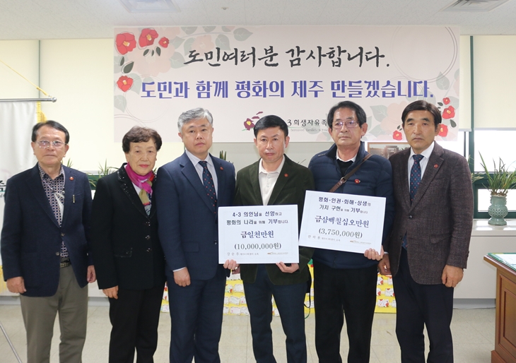 18일 4·3 국가보상금을 기부한 강순주씨 아들 강경돈씨(사진 왼쪽에서 네 번째)와 한백흥 지사 손자 한하용씨(사진 왼쪽에서 다섯 번째)가 보상금을 전달 후 기념 촬영을 하고 있다. 제주4·3유족회 제공