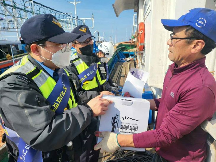 제주해경 대원들이 어선 화재 사고 예방을 위해 소화장비를 전달하고 있다. 제주지방해양경찰청 제공