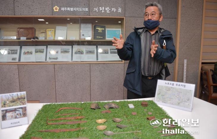 4·3통일의길 마중물 배기철 씨가 발견된 유물들에 대해 설명하고 있다. 이상국기자