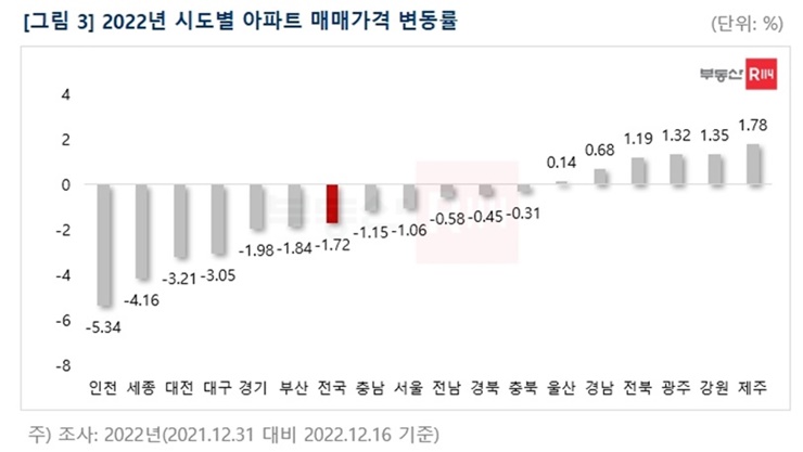 지역별로는 2021년 한해 34.52% 올라 전국에서 상승폭이 가장 컸던 인천이 5.34% 떨어져 최대 하락률을 나타냈다. 이어 세종(-4.16%), 대전(-3.21%), 대구(-3.05%), 경기(-1.98%), 부산(-1.84%) 순으로 내렸다.