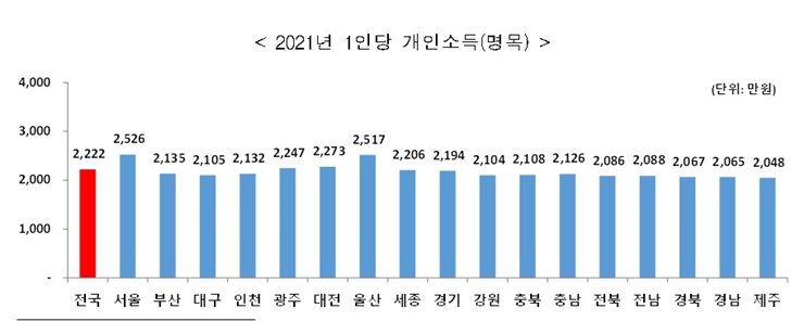 1인당 개인소득도 2048만원으로 가장 낮은 수준