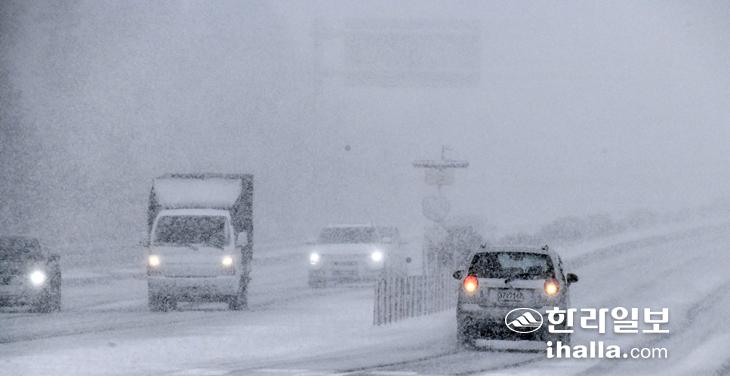 22일 폭설이 쏟아지는 제주 번영로. 강희만 기자