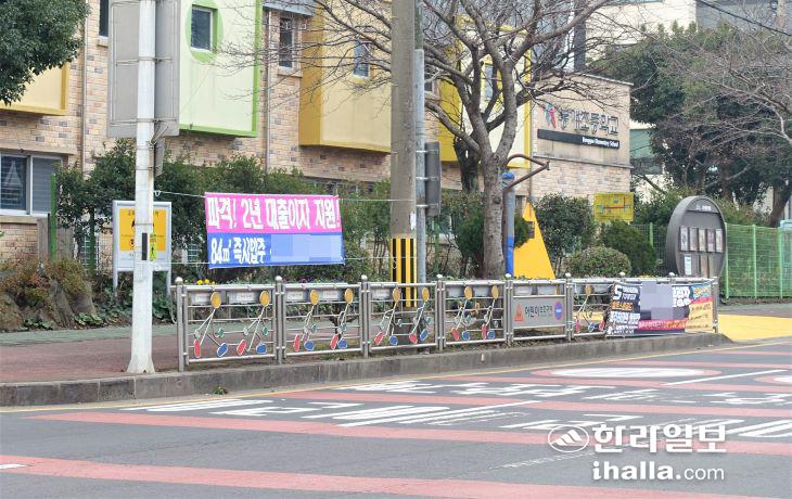 지난 1일 제주시 봉개동 봉개초등학교 앞 도로에 불법 현수막들이 게시돼 있다. 김도영기자