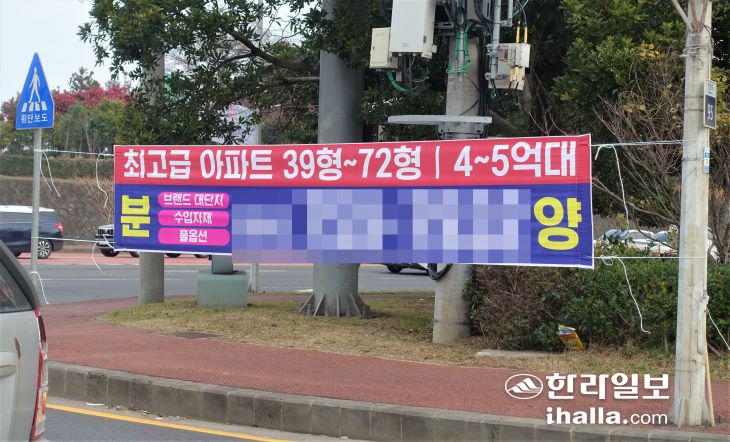 지난 1일 제주시 거로사거리에 게시된 불법 현수막. 김도영기자