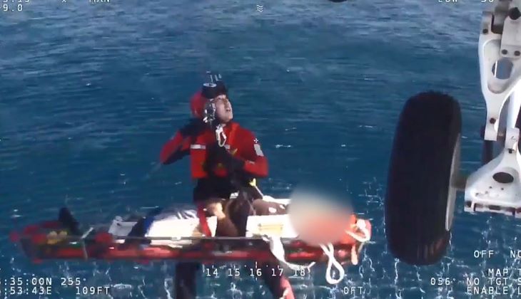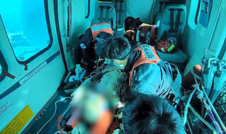 제주해경 구조대원이 지난 8일 제주시 우도 북쪽 약 17㎞ 해상에서 발생한 응급환자를 헬기 호이스트를 이용해 구조하고 있다. 제주지방해양경찰청 제공