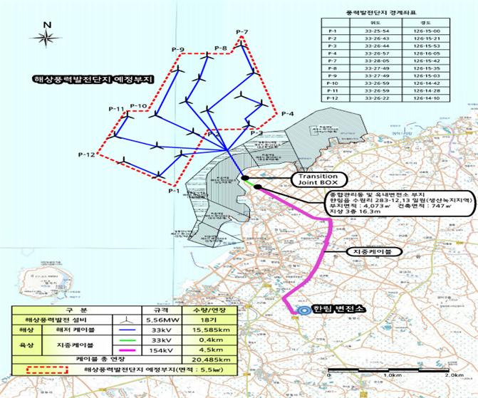 한편 이 사업은 오는 2023년까지 5741억원을 투자해 제주시 한림읍 수원리 해역 546만9000여㎡에 5.56㎽급 풍력발전기 18기를 설치하는 것이다. 풍력발전기 18기를 가동해 얻는 발전 전력은 100㎿로, 286가구(4인 가족 기준)가 1시간 동안 동시에 쓸 수 있는 양으로 국내 최대 규모다. 도내 최대인 제주시 한경면 두모리 탐라해상풍력 발전용량 30㎿에 비해서는 3배 이상 크다.